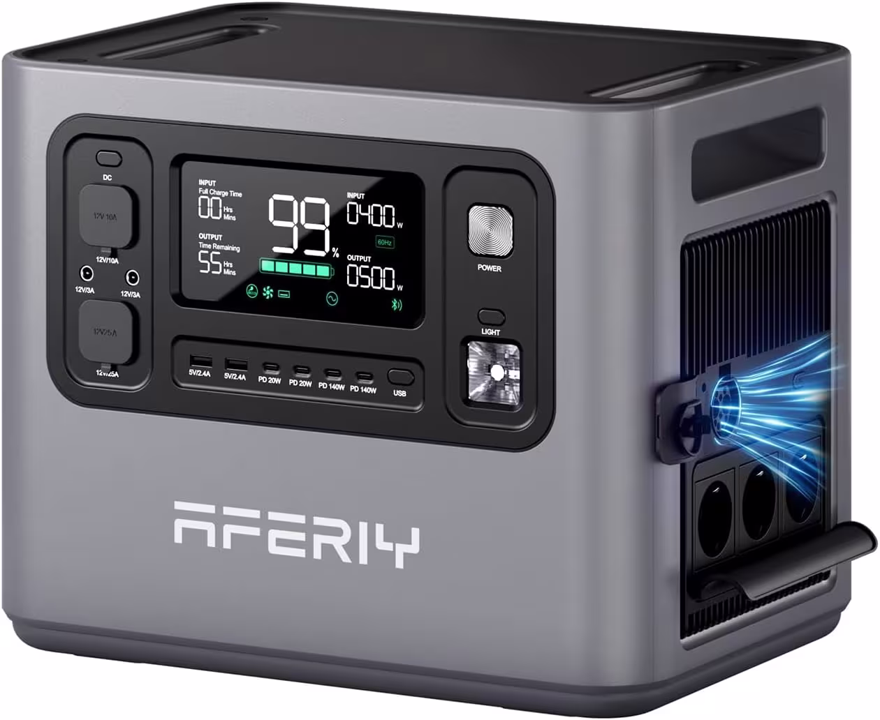 Die leistungsstärkste Powerstation der AFERIY-Serie. Erweiterbare Kapazität bis 10,24 kWh, ultraschnelle Aufladung in 1,5 Stunden, 13 Ausgänge.